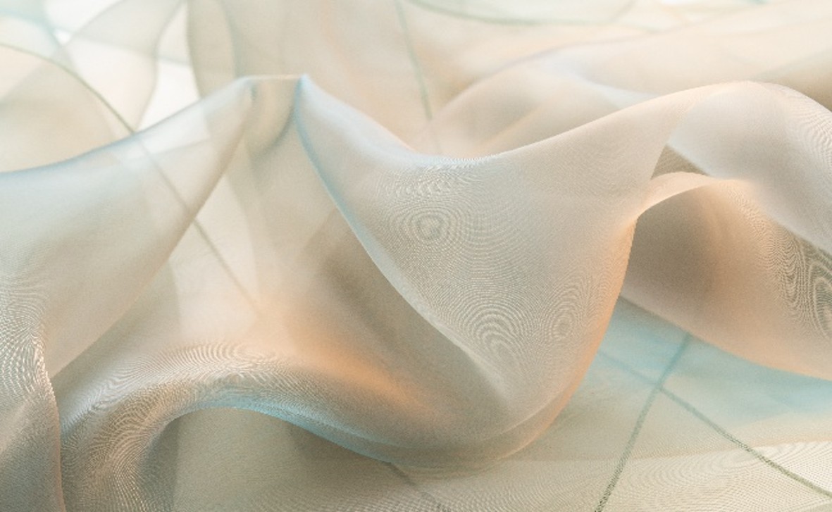 最大の特徴は、髪の毛の約5分の1から6分の1という、目に見えないほど細い超極細ポリエステル糸で織り上げられていることです。1平方メートルあたりの重さはわずか数グラムと、まさに「空気のような軽さ」を実現しています。風に吹かれると水面のように美しく揺らめき、肌に触れていることを忘れるほどの心地よさを提供します。